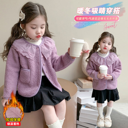 韩嘟服饰&紫色花边加绒毛毛衣外套